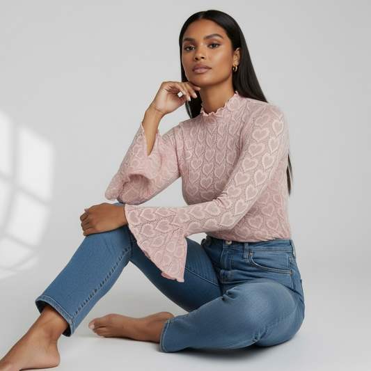 Heart Pink Flare Sleeve Mock Neck Fitted Top