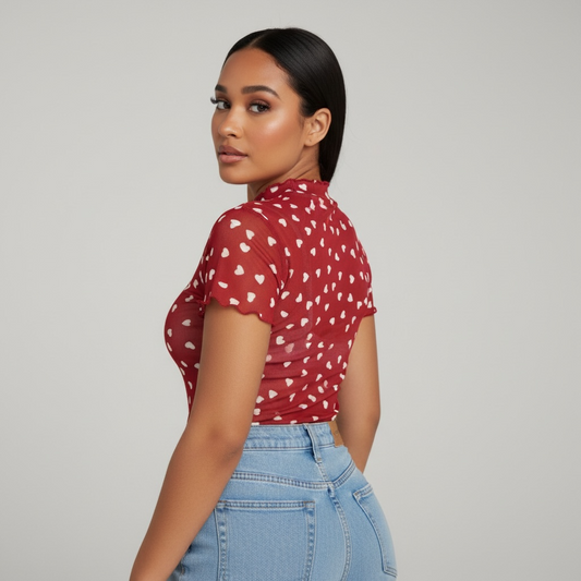 Allover Heart Mock Neck Mesh Red Top