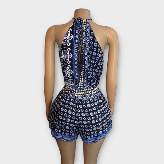 Mono corto con escote halter y abertura en la boca de cerradura para mujer en color azul