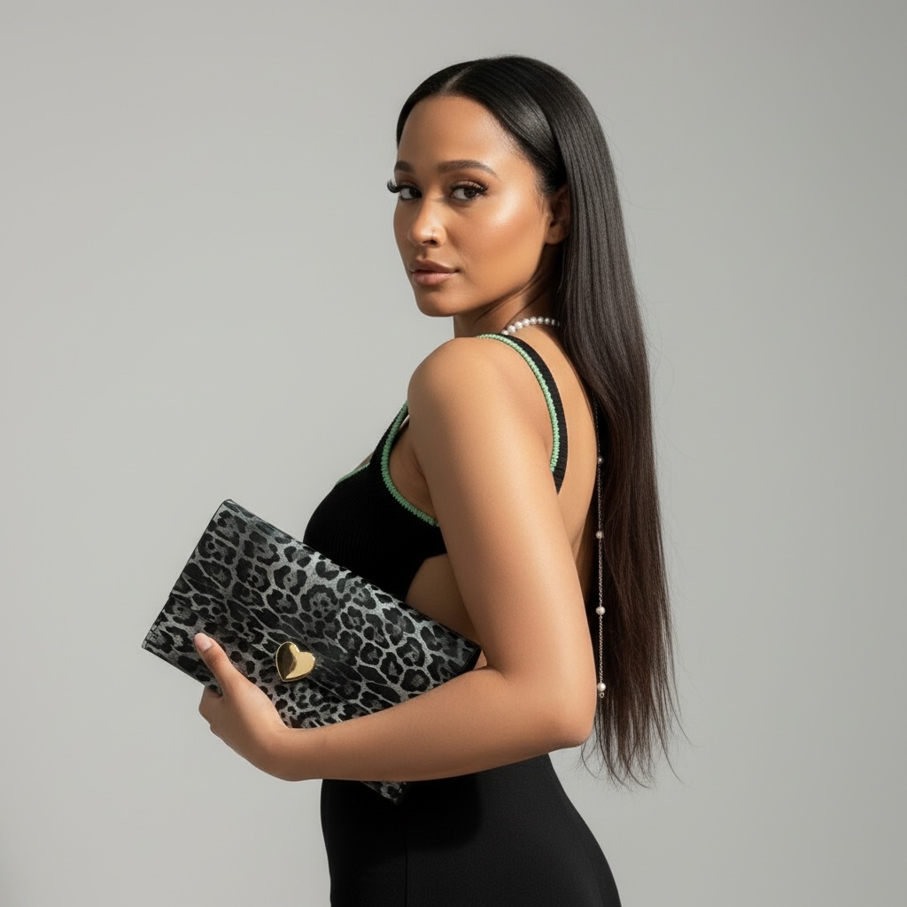 Strut your stuff with this sleek leopard print envelope handbag that's all about effortless edge. The flat rectangular design in synthetic leather keeps lines clean and modern, while a playful heart accent steals the show at center. Flip cover closure snaps shut with ease, and the open interior means no hunting through pockets—just grab and go. Perfectly proportioned at 11½ inches wide by 6½ inches long, it's your new go-to for adding wild flair to any outfit.