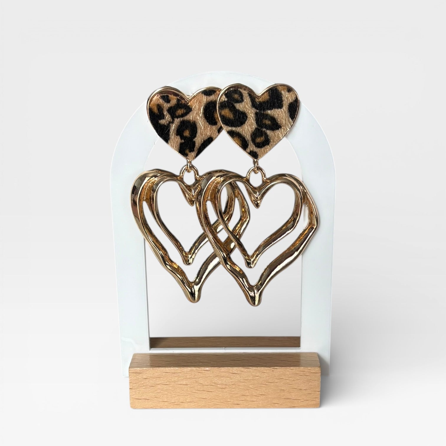 Leopard Print Heart Dangle Earring Make a bold statement with these eye-catching dangle earrings featuring a striking leopard print heart design. Crafted from lightweight alloy with a warm gold finish, these 2½-inch earrings deliver maximum impact without the weight. The playful animal print adds instant personality to any outfit, while the romantic heart shape keeps the look feminine and versatile. Perfect for adding a touch of wild elegance to your everyday style or special occasions.