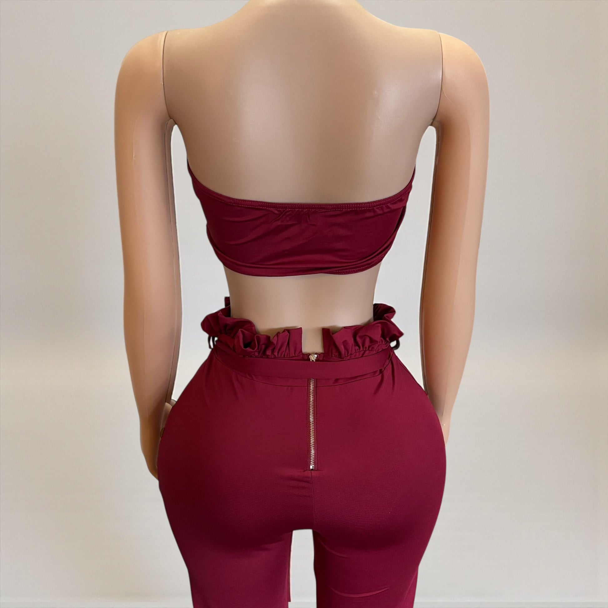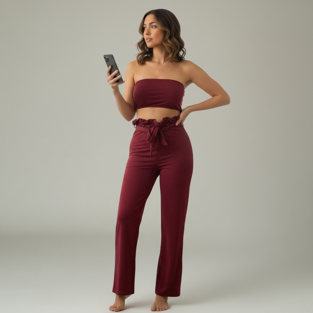 Disfrute de la lujosa elegancia de nuestro conjunto largo de dos piezas en color burdeos para mujer, que incluye una parte superior e inferior con un estilo de pantalón ancho con cordón en la cintura. Realce su guardarropa con este conjunto sofisticado y exclusivo, perfecto para quienes tienen un gusto exigente en cuanto a moda.