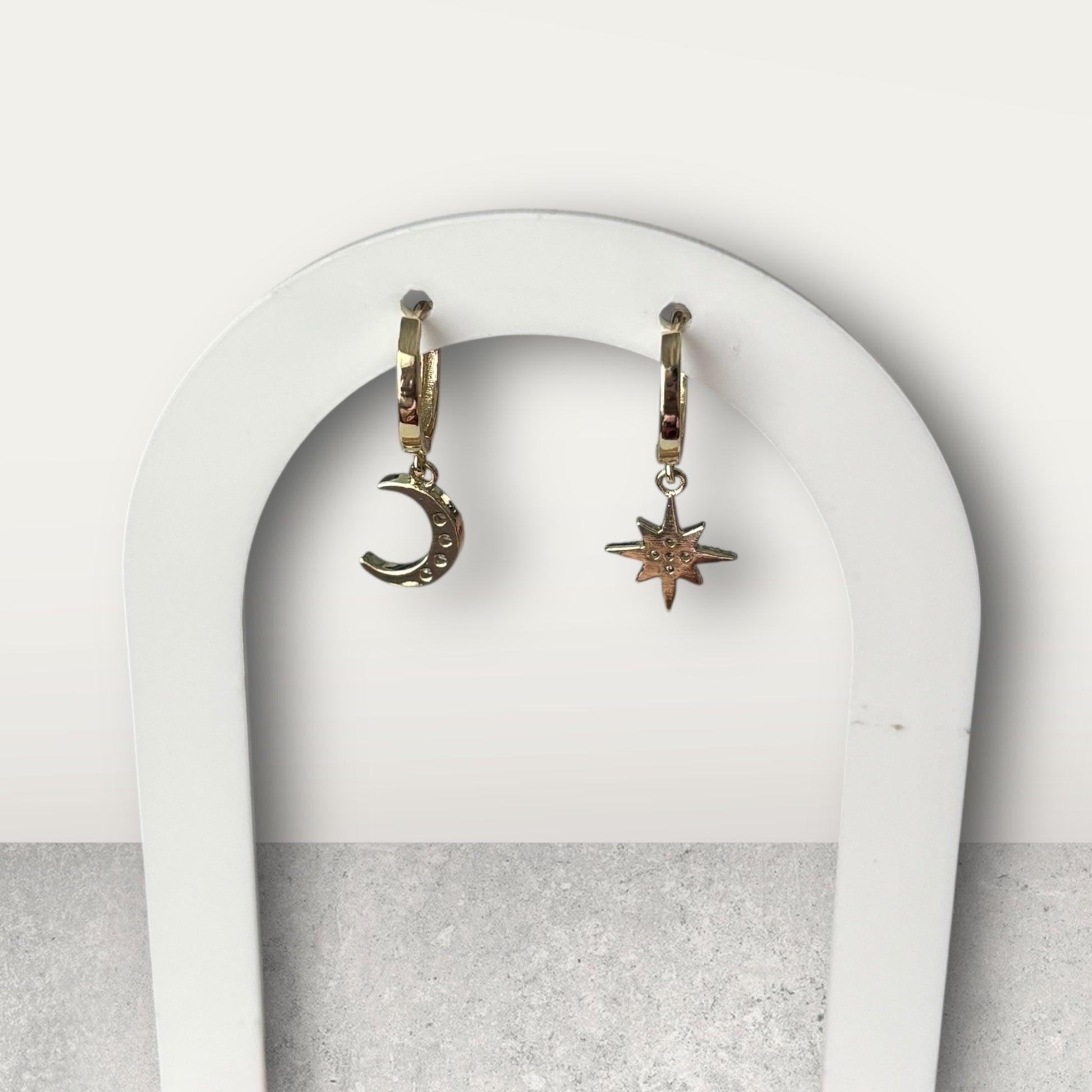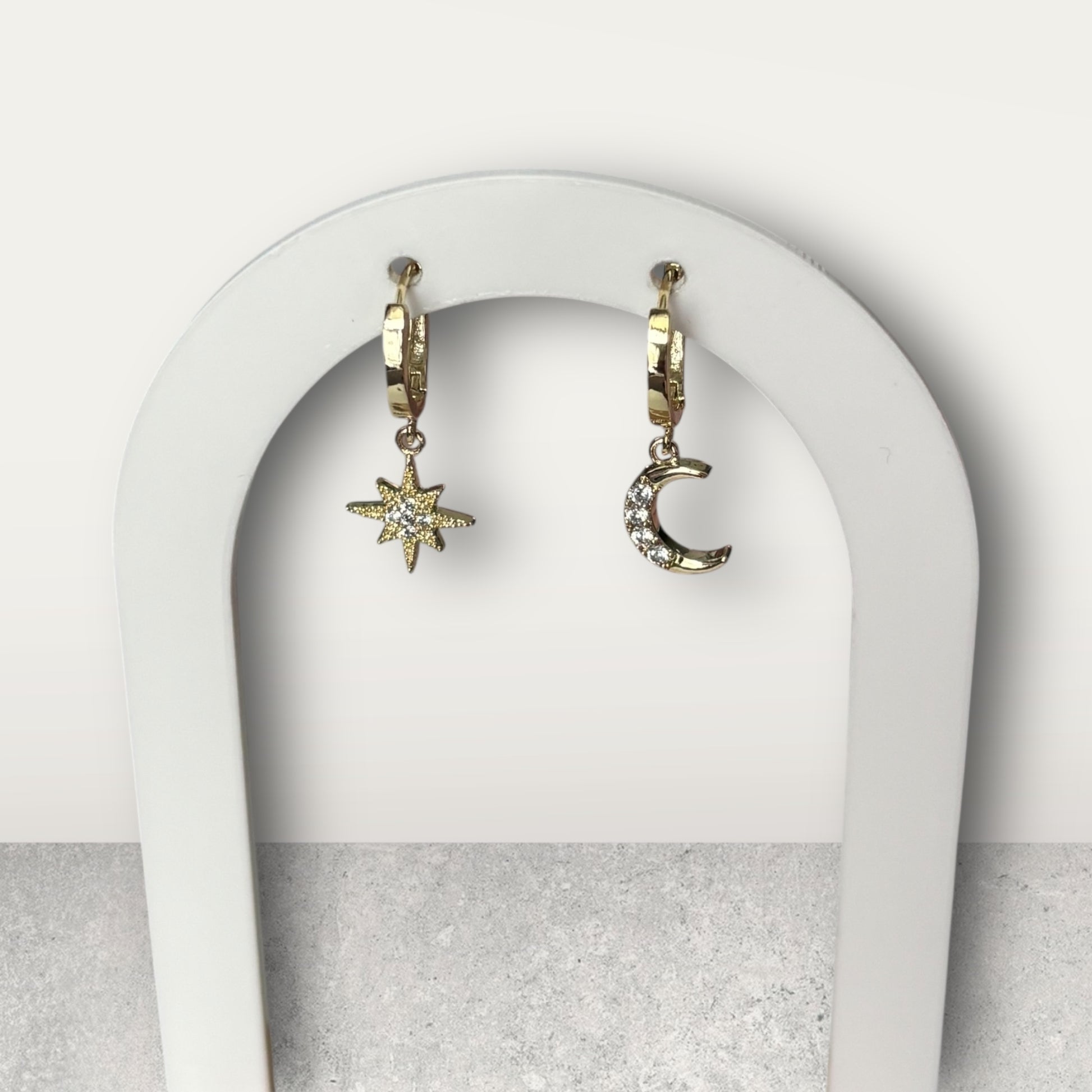 These elegant Star and Moon Earrings will make any outfit look classy. Crafted with gold-plated metal, these dainty earrings feature a star and moon design, and measure just 0.75 inches tall. Perfect for adding a touch of timeless beauty to any look.
